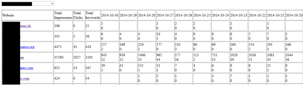 Your website list, keywords, clicks, average positions.