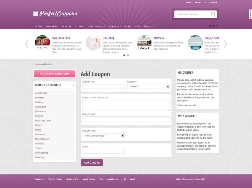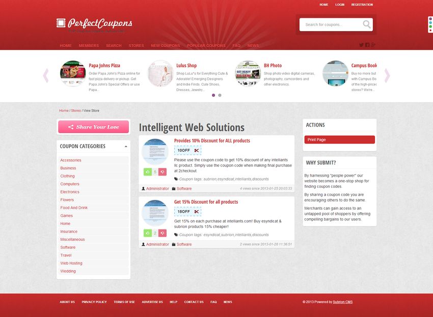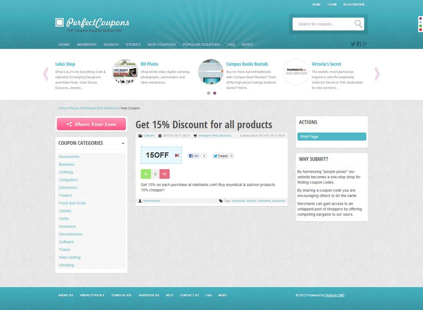 ModsGuru coupons script is the powerful php coupons script that is built on top of Subrion Open Source CMS. You can easily create a website like retailmenot.com without any technical knowledge. Coupons script does the work for you.